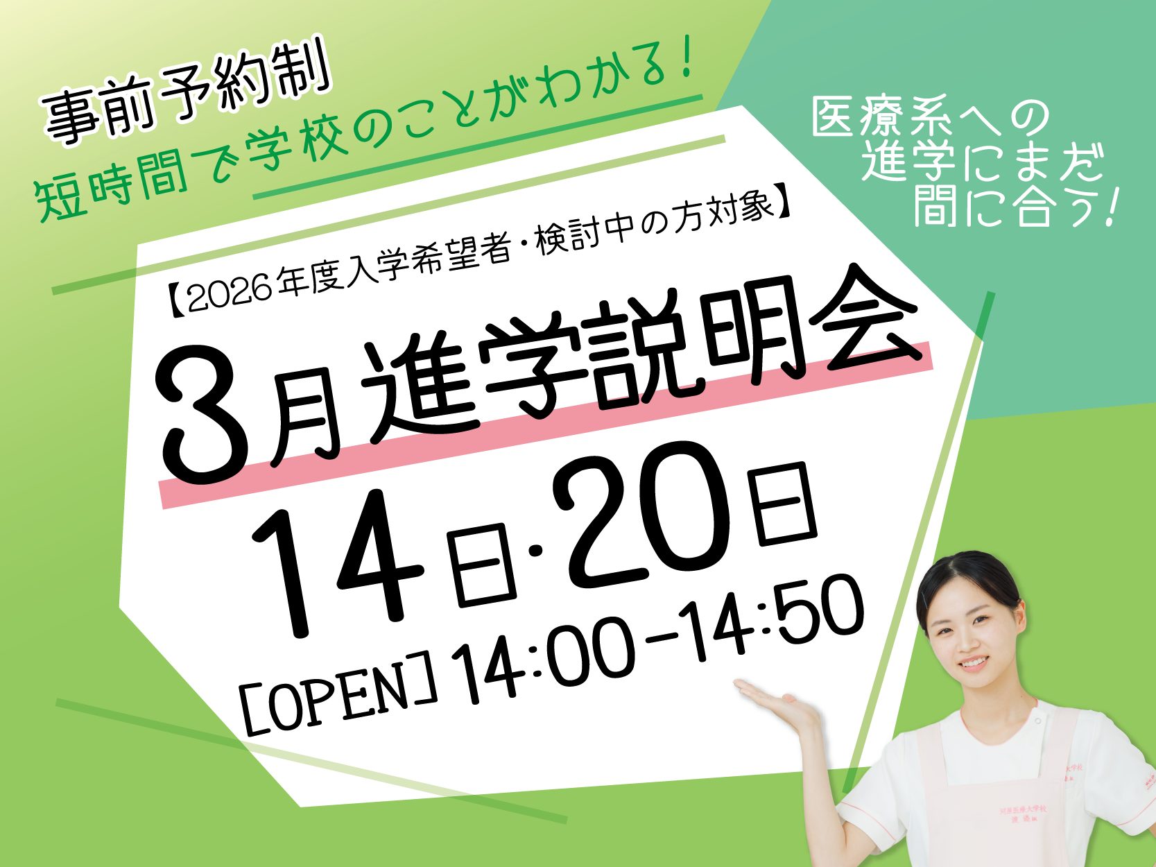 (例:「3/20の進路相談会に参加したいです。名前/学校名/学年/興味のある学科●●学科」)